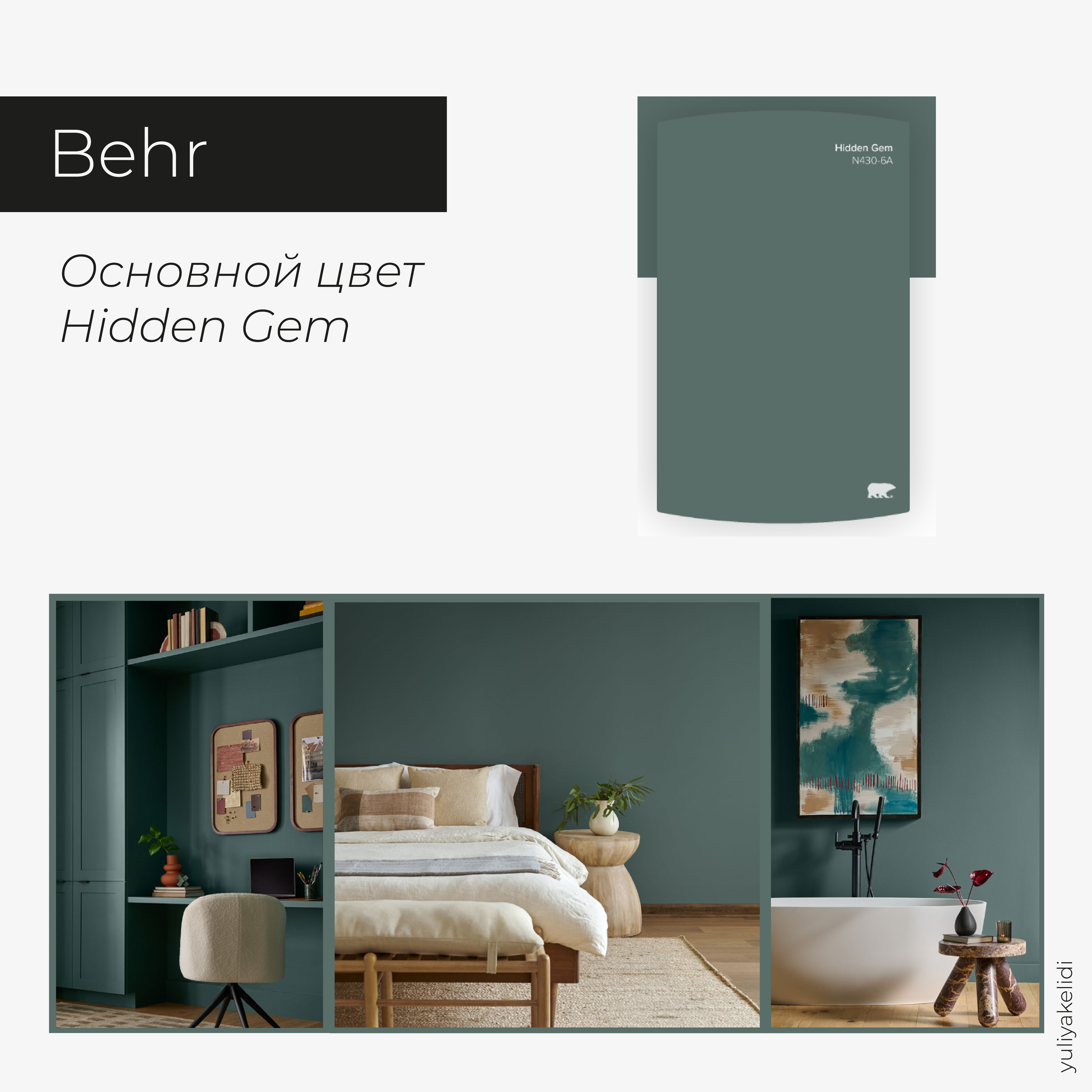 Компания Behr выбрала цветом 2026 более приземлённый цвет, но весьма оригинальный и красивый оттенок. Подойдёт он не всем, но его можно применить на более обширные площади, нежели предыдущие 2 цвета. Это цвет Hidden Gem